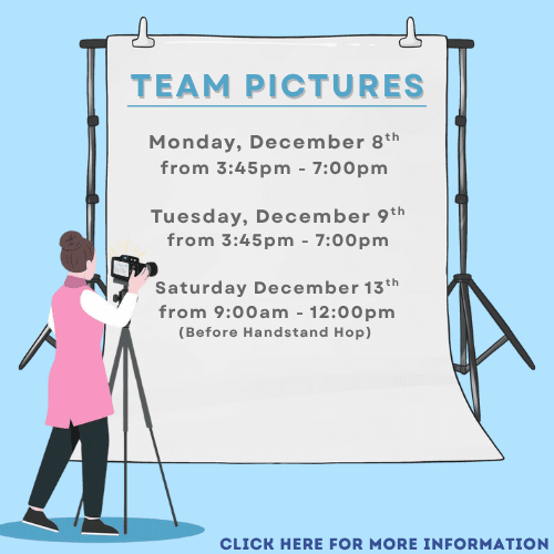 Have you athlete bring their competition leotard which they will wear for the pictures and bring another leotard to wear to practice. Your athlete can take photos anytime between 3:45pm – 7:00pm, however we suggest them taking pictures before practice as they will most likely be tried and sweaty.