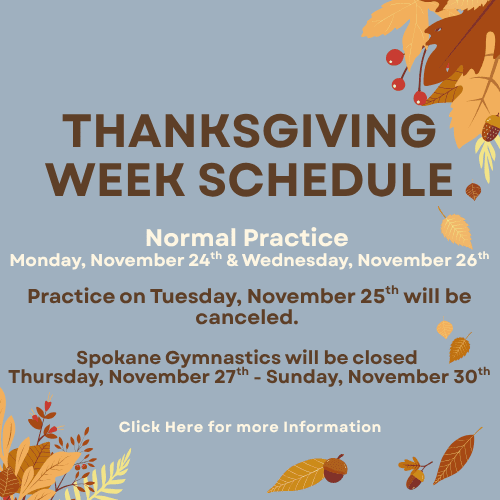 - Thanksgiving Week: Monday, November 24 & Wednesday, November 26 we will be open for normal practices. Practice on Tuesday, November 25th will be canceled and Spokane Gymnastics will be closed November 27th – 30th.