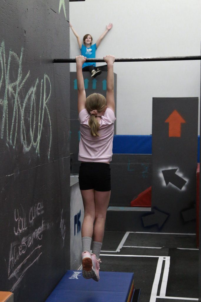 An advanced class where students learn to apply mastered skills confidently and safely, and there is an emphasis on skills involving height and acro elements. Students train in the main gym, with various obstacles, including salmon ladder, and in the 800 s.f. parkour-specific room with wooden obstacles with bars.